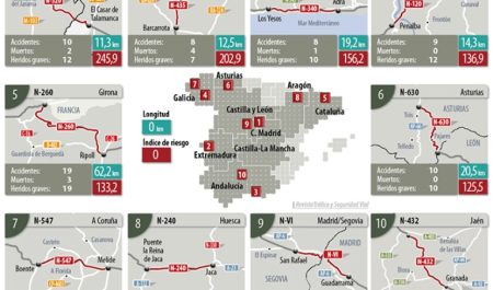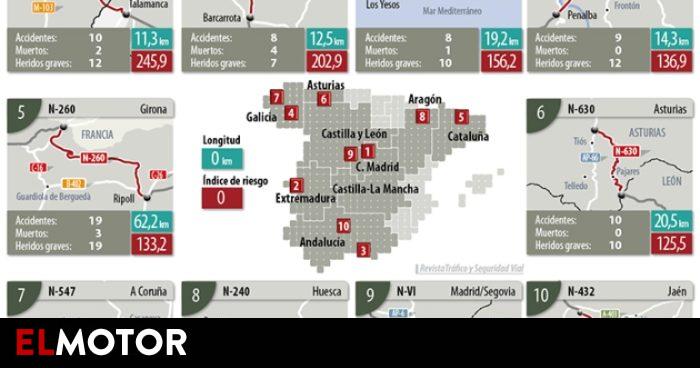 Las diez carreteras más peligrosas y con mayor siniestralidad del país se sitúan en las provincias de Badajoz, Granada, Almería, Lugo, Ourense, Girona, Asturias, A Coruña, Huesca, Madrid, Segovia, Guadalajara y Jaén.