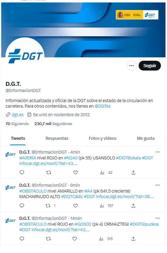 En relación a Twitter, la cuenta específica de información en tiempo real es @informacionDGT. Se actualiza constantemente detallando los niveles de colores de la incidencia, enlazando el mapa con la locación exacta.