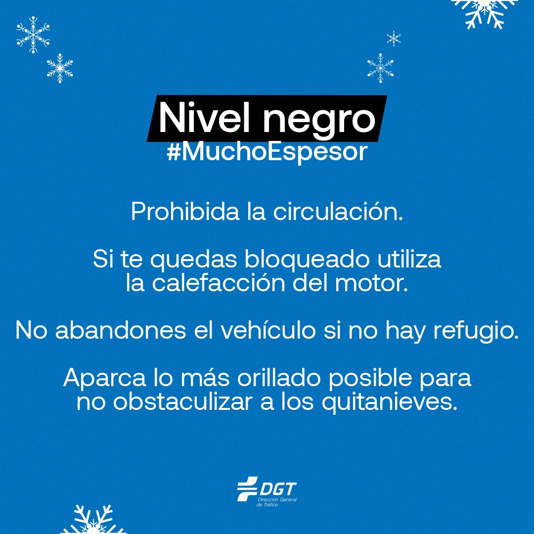 Esta es la última categoría del código de colores que utiliza la DGT. El nivel negro se activa cuando el espesor de la nieve es ingente en las vías. Los impedimentos ante este escenario son: