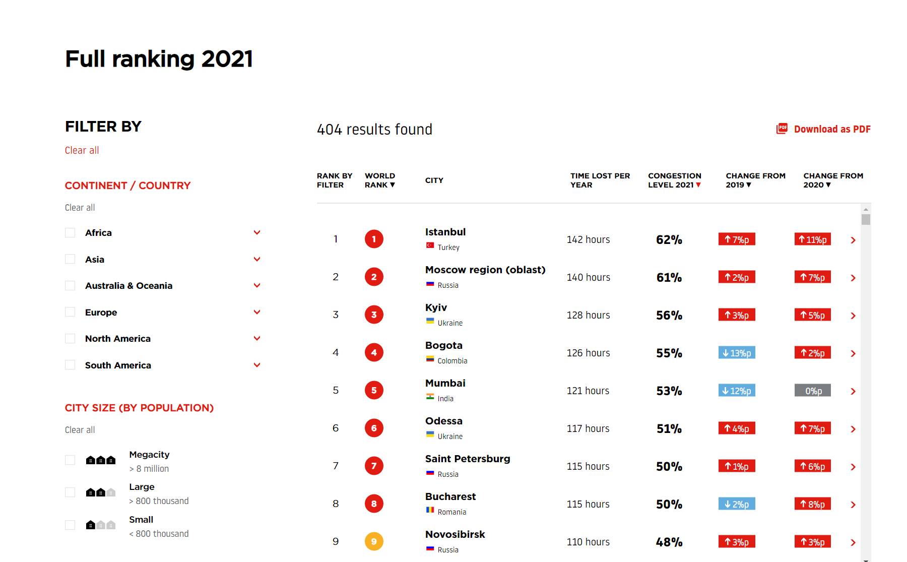 Estas ciudades se encuentran entre las 300 con peores atascos del planeta, con Barcelona en el número 119. Aquí se puede observar la diferencia de esta herramienta respecto al estudio de INRIX, ya que Madrid pasa de la primera a la novena posición.