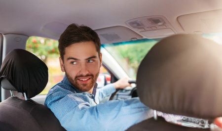 Un conductor, maniobrando hacia atrás en el coche.