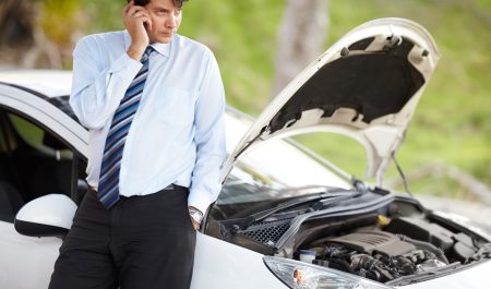 Un conductor junto a su coche averiado.