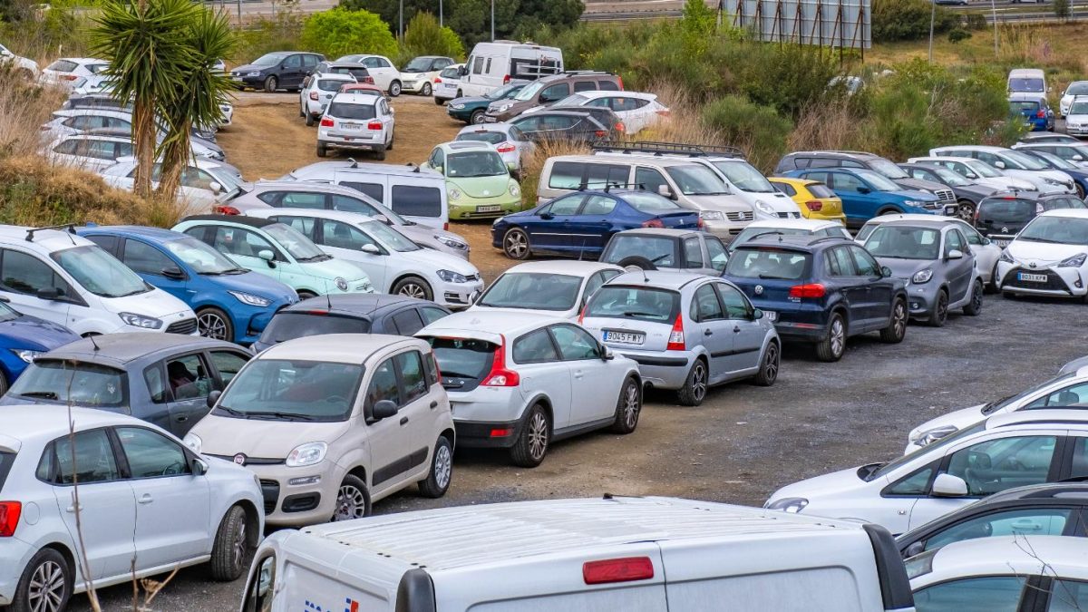 Varios coches estacionados a las afueras de una localidad española.