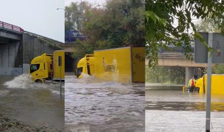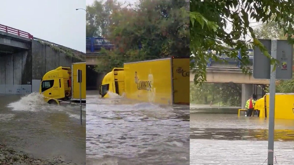 Así relata un usuario la situación vivida este jueves. El conductor de un camión hizo caso omiso a la situación, cruzó la cinta de advertencia y entró en un camino cortado, evidentemente por la abundante lluvia y el agua acumulada. Para suerte del conductor, salió por la ventana al techo.