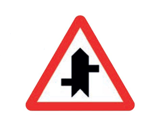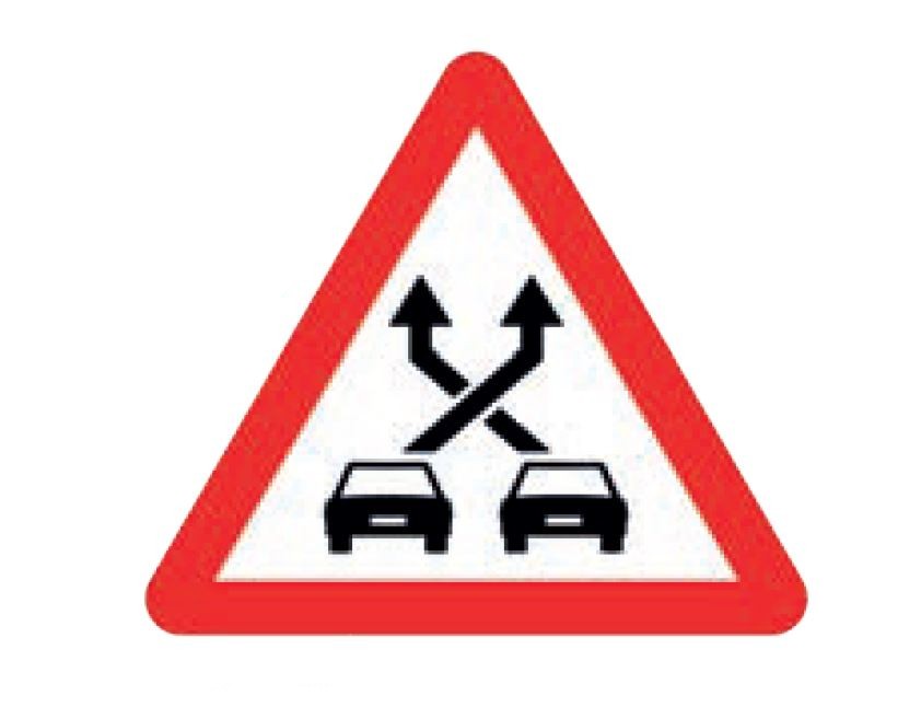 P-35. Trenzado. Peligro por la proximidad de un tramo comprendido entre una confluencia y una bifurcación donde se producen distintos movimientos de cambio de carril.