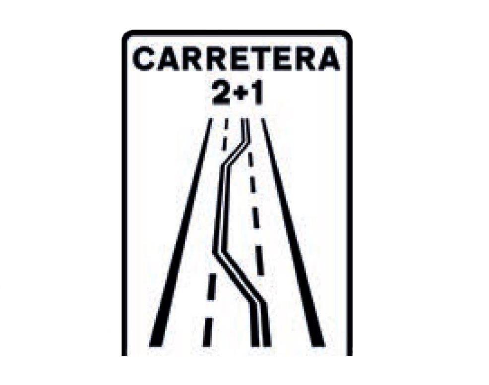 S-1c. Carretera 2+1. Indica el principio de una carretera 2+1: tiene tres carriles y circulación en ambos sentidos. El carril central se utiliza para adelantar y se reserva de manera alterna a uno y otro sentido.