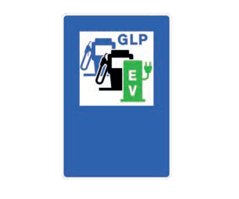 S-105 (a-f). Surtidor de carburante. Indica la situación de una estación de servicio. Habrá diferentes placas, en función de si se dispensa GLP o hay recarga eléctrica, o ambos a la vez.