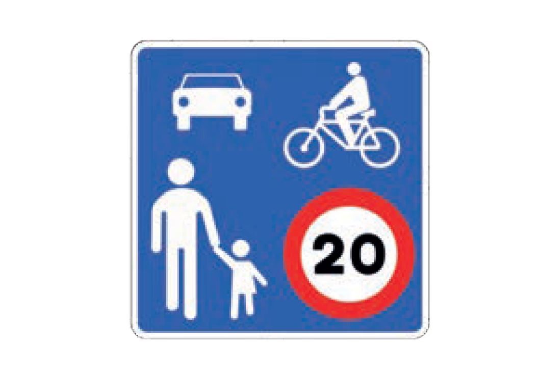 S-47. Zona de coexistencia. Indica una zona de circulación compartida, pero con prioridad para los peatones y con una velocidad máxima para los vehículos de 20 km/h.
