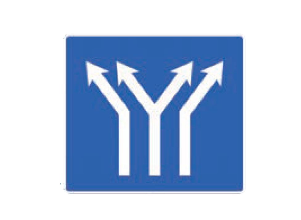 S-63b. Bifurcación en calzada de tres carriles. Indica, en una calzada con tres carriles de circulación en el mismo sentido, que se producirá una bifurcación en el carril central con cambio de dirección de los cuatro carriles resultantes.