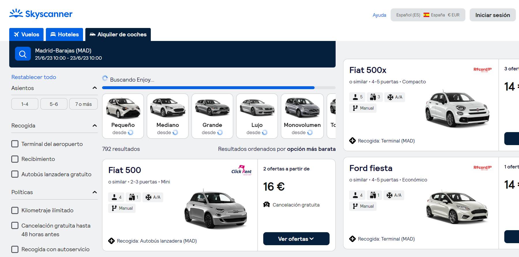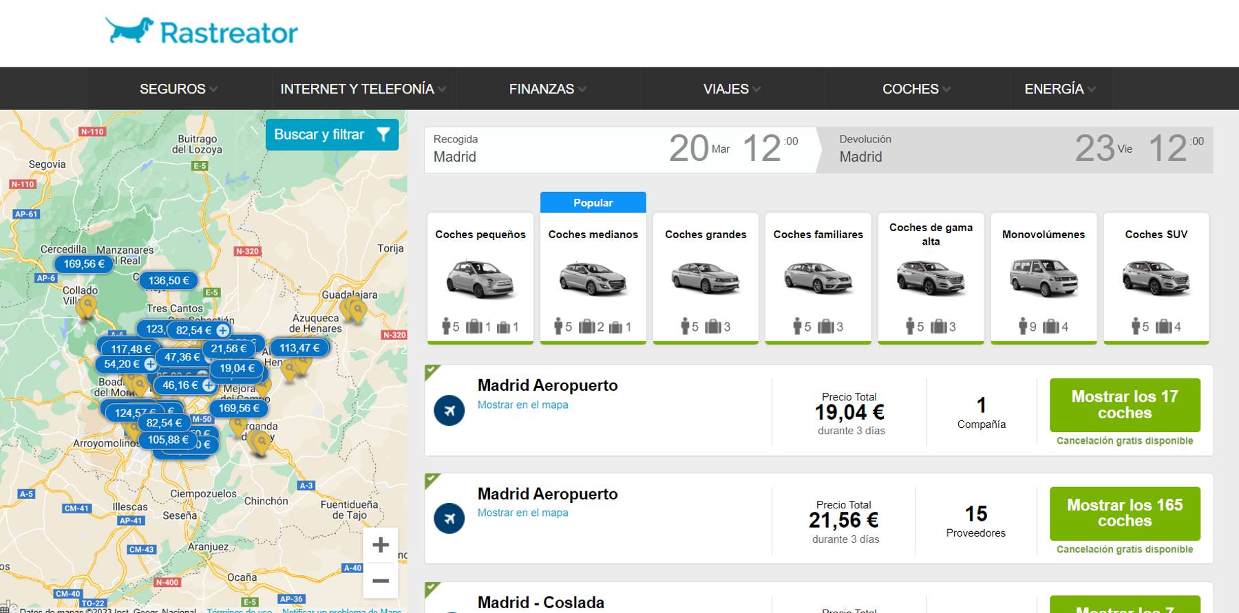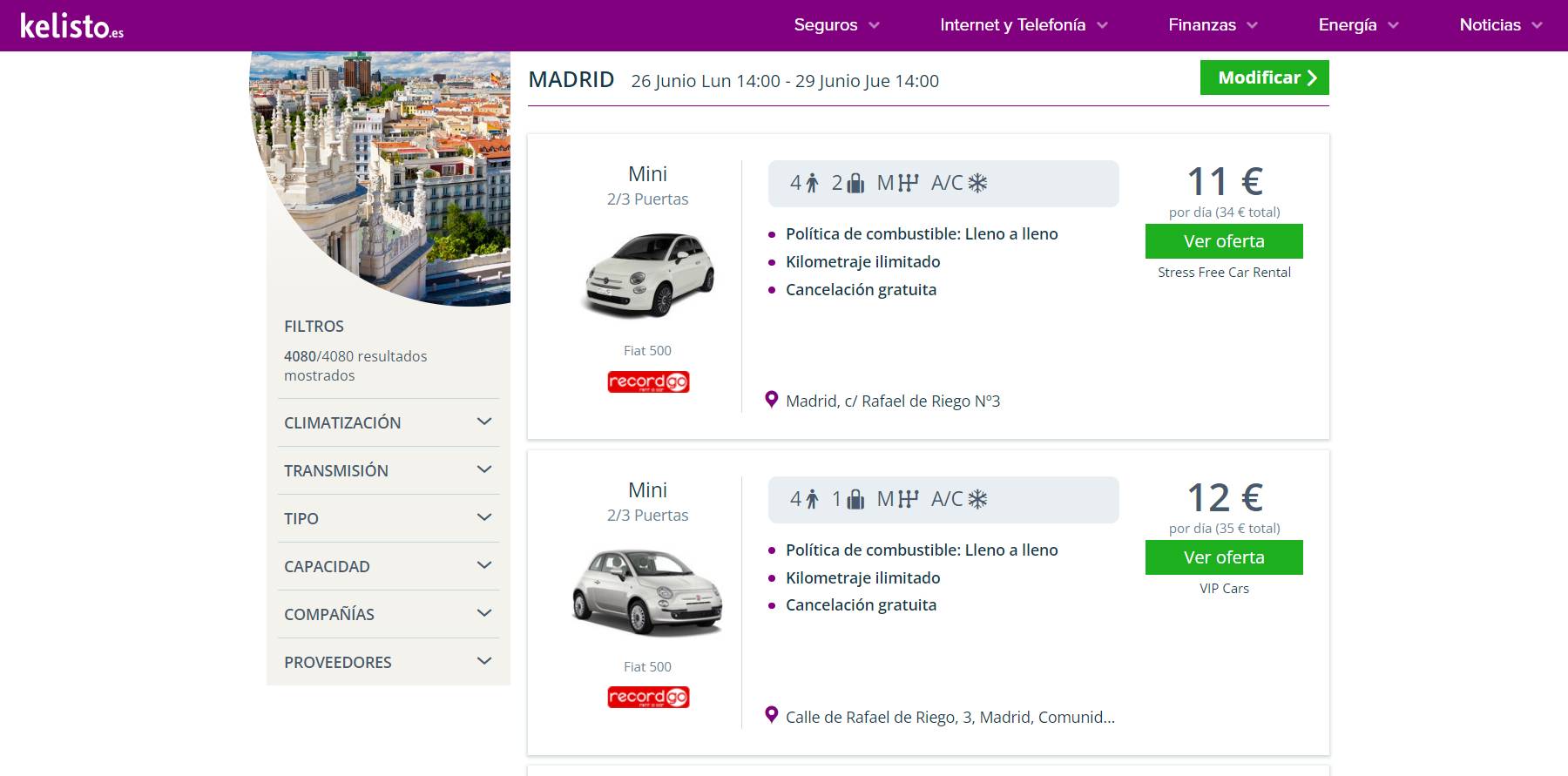 Este buscador compara precios de vehículos de alquiler entre más de 25 proveedores y compañías del sector. Permite buscar por ciudades y se pueden filtrar los resultados por el tipo de transmisión, la climatización, la carrocería o el número de plazas.