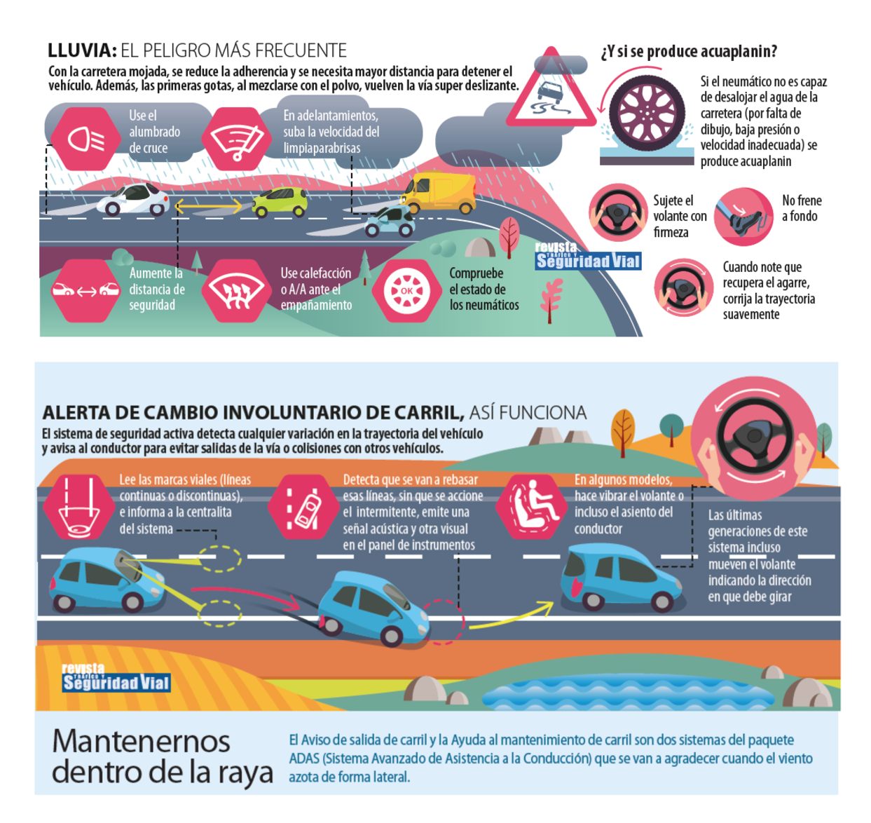 Cuando la lluvia es intensa, se puede producir el efecto aquaplaning, que consiste en la pérdida de contacto de los neumáticos con el asfalto debido a la acumulación de agua. En esta situación, se debe evitar frenar bruscamente sin dejar de sujetar firmemente el volante, reduciendo gradualmente la velocidad hasta recuperar el control del vehículo.