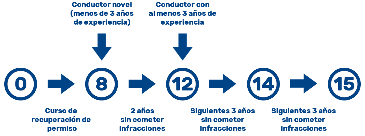 El 1 de julio de 2006 entró en vigor en España el sistema del carnet de conducir por puntos. Una persona que acaba de obtener el permiso cuenta con ocho puntos. Si transcurridos dos años no ha recibido ninguna multa, los ocho puntos pasan a ser 14. Asimismo, tras otros tres años sin infracciones, se sumará otro punto más, quedando el total en 15.