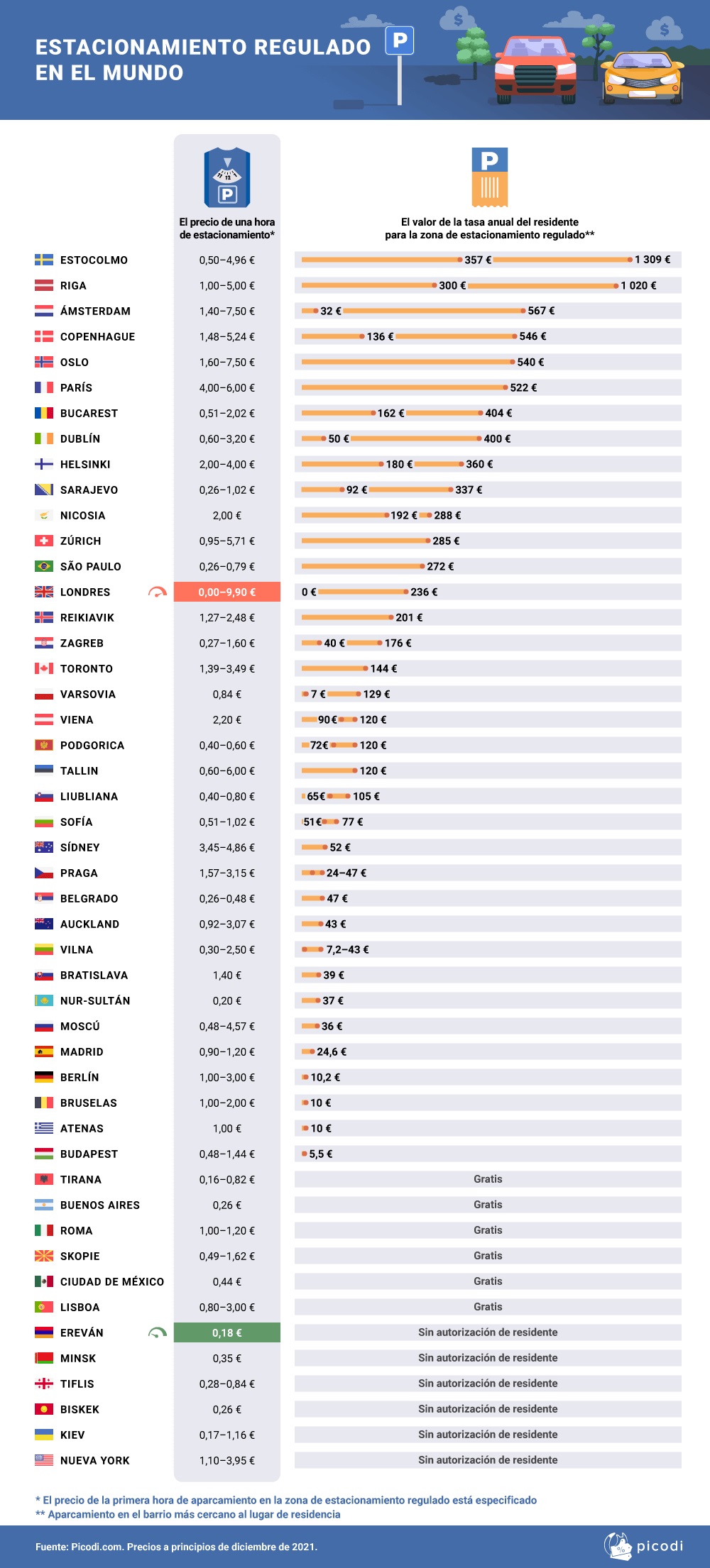 En el Europa es la capital del Reino Unido la que se lleva la palma de ser la ciudad donde más caro resulta aparcar el coche: una hora de estacionamiento en el Gran Londres puede costar 9,9 euros la hora, un precio exorbitado frente a la ciudad más barata de las analizadas que es Ereván, capital de Armenia, donde la zona regulada tiene una tarifa de tan solo 0,18 euros la hora.