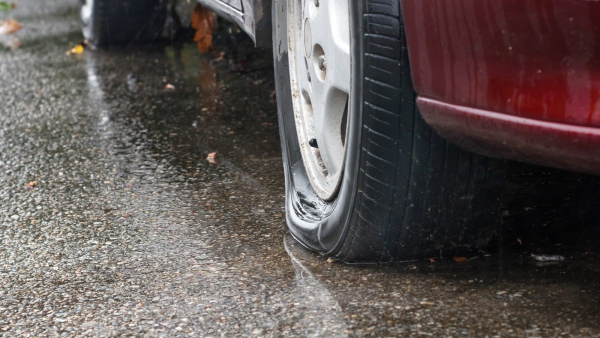 Un neumático desgastado y con poca presión sobre una carretera mojada.