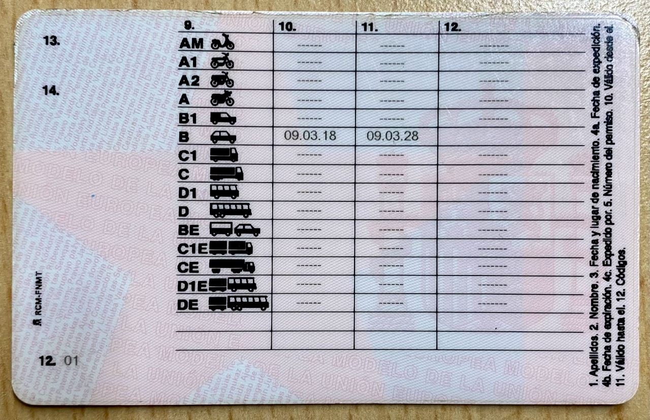 Los permisos expedidos antes del 1 de enero de 2017 muestran solo el genérico 01,  pero siguen siendo válidos hasta que expire su vigencia o el titular los sustituya por cualquier otra razón, como la pérdida o el robo.