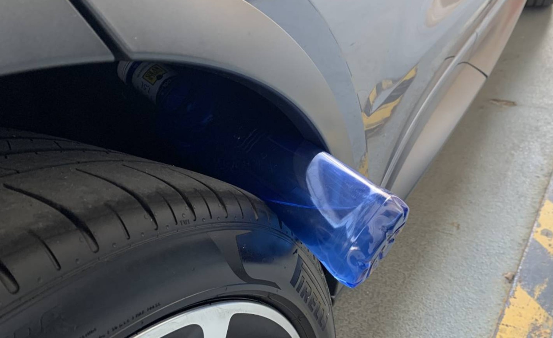 La trampa es muy sencilla de ejecutar. Consiste en que los delincuentes introducen una botella de plástico entre el neumático y el paso de rueda mientras el vehículo se encuentra estacionado, generalmente en el lado del copiloto, ya sea en el eje delantero o el trasero.