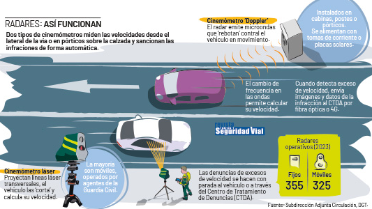 La presencia de los radares en carretera también ha crecido en las últimas dos décadas. A principios del 2004 había apenas 90 instalados. A finales de 2023, hay operativos un total de 355 fijos, 325 móviles y 64 de tramo. Estos números no contemplan los radares de País Vasco ni Cataluña.
