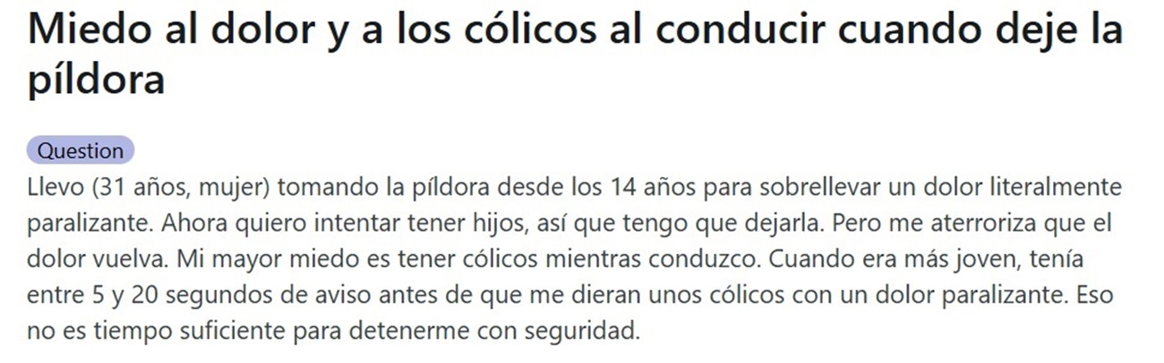 Ante estos síntomas, en algunas mujeres el temor a conducir se hace presente. Así lo explica esta afectada en un foro de Reddit. “Mi mayor miedo es tener cólicos mientras conduzco. Cuando era más joven, tenía entre cinco y 20 segundos de aviso antes de que me dieran unos cólicos con un dolor paralizante. Eso no es tiempo suficiente para detenerme con seguridad”, confiesa.