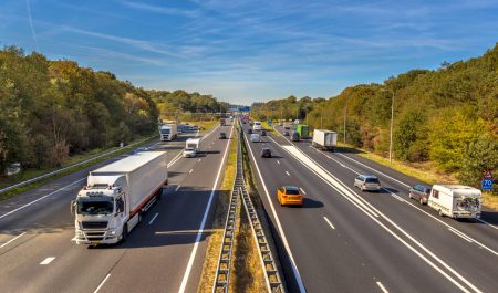 Coches y camiones circulando por una autovía.