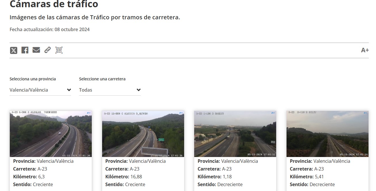 Para acceder a estas imágenes, en el menú superior de la web de la DGT hay que ir a la sección ‘Estado del tráfico’ y pinchar en ‘Cámaras de tráfico’. A partir de aquí, el funcionamiento es sencillo: basta con elegir la provincia y luego la carretera.