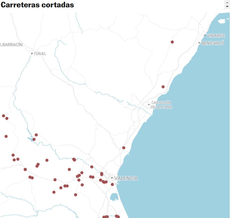 Las afectaciones más graves se sitúan en carreteras de Valencia, con cortes en algunos tramos de la A-7 en ambos sentidos, en la vía que la conecta con Alicante y entre Quart de Poblet y Torrent, así como en las carreteras N-3, N-322 y N-332 a su paso por las localidades de Chiva, Picanya, Aldaia, Algemesí, Cheste, Sedaví, Buñol, Requena, Sagunto y Sueca, entre otros municipios.