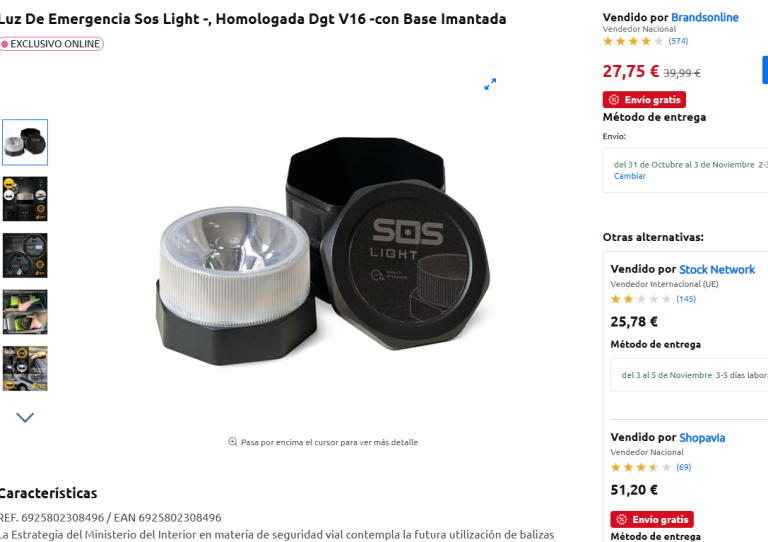 Sucede que a las grandes superficies les sobran estos dispositivos, de modo que ahora los ofrecen a precios más económicos para deshacerse de las existencias. Carrefour, por ejemplo, comercializa la baliza Sos Light por 27,75 euros; es mucho más económica que otros modelos conectados a la DGT 3.0, pero caducará dentro de dos meses. Incluso ofrece un dispositivo sin homologación alguna por menos de 16 euros.