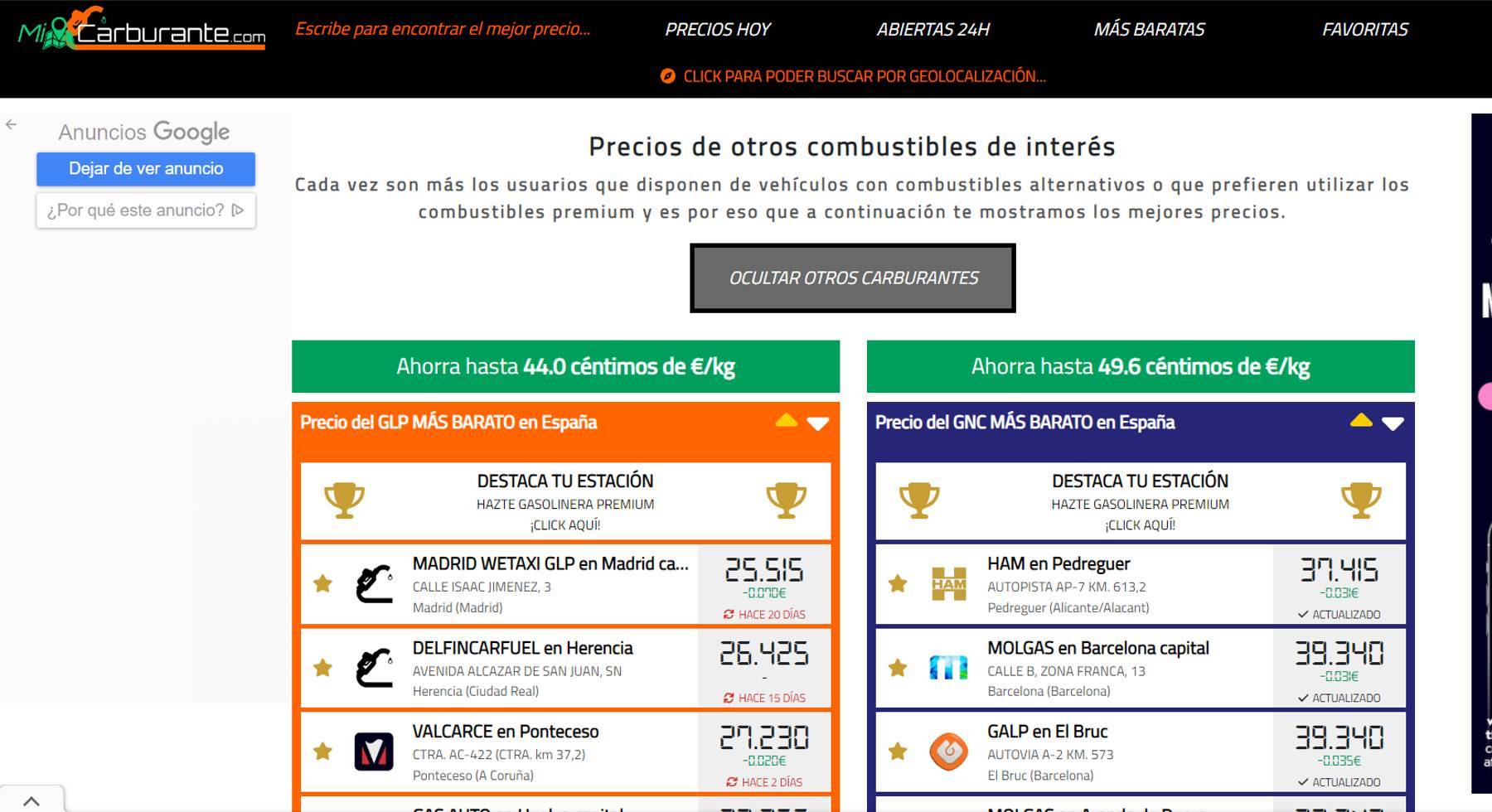 Para aquellos usuarios que utilicen otros carburantes que no sean la gasolina y el diésel, el sitio web también ofrece el precio del GLP y el GNC. El método es el mismo, se insertan los litros del depósito, se pincha la pastilla “mostrar otros carburantes” y se abren dos cuadros con los precios más baratos de España de GLP y GNC.