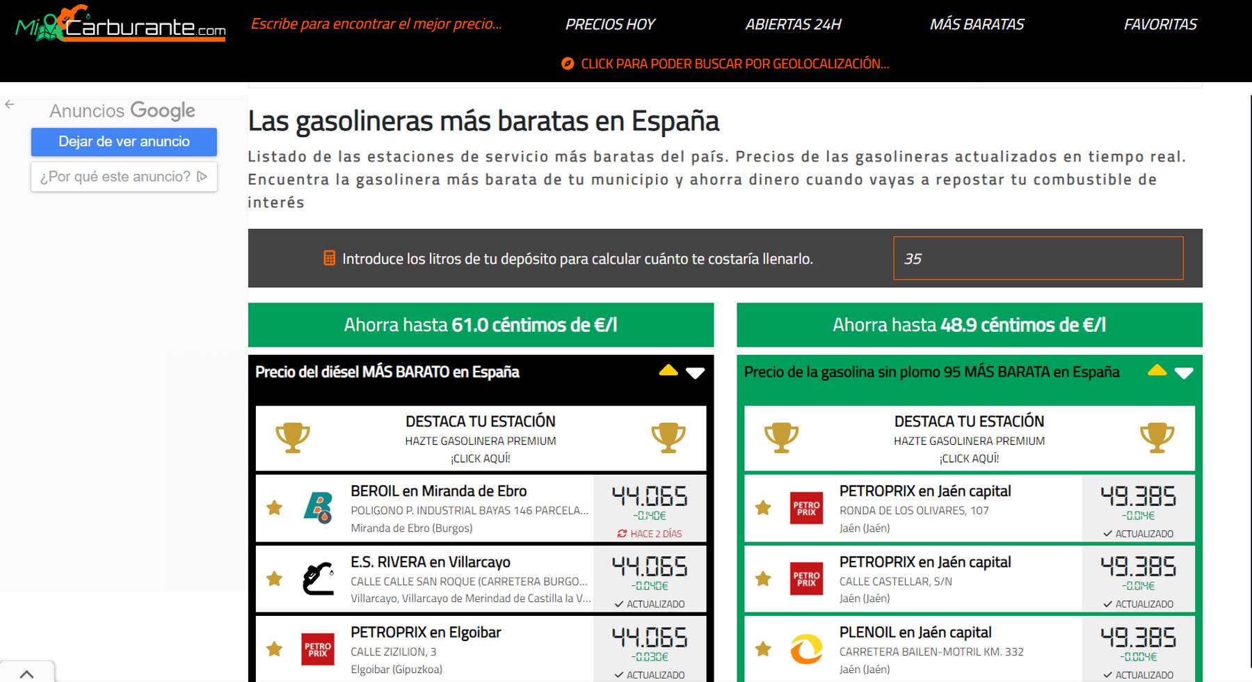 En el cuadro de diálogo se escriben los litros del depósito del vehículo del usuario. Inmediatamente, la web arroja dos columnas de precios: el diésel a la derecha y la gasolina a la izquierda. Cada una de las columnas muestra los resultados de las estaciones de servicio más baratas de ese carburante en todo el territorio nacional.