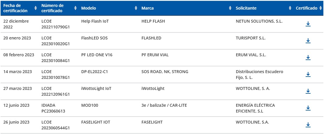 Para asegurarse de que una luz de emergencia está en regla, el camino más corto es verificar el código de certificación. Debe comenzar por las siglas LCOE o IDAE, que acreditan la homologación, y aparecer en el listado oficial en el que la DGT recopila todas las marcas y modelos autorizados, junto con su fecha de certificación.