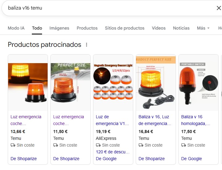 Cualquier búsqueda despistada puede conducir a una mala compra. Si se teclea en Google “baliza v16 temu”, la respuesta del buscador es un problema: los cinco primeros productos patrocinados, los más llamativos, todos con foto, son dispositivos que están fuera de la norma. Baratos e inservibles.
