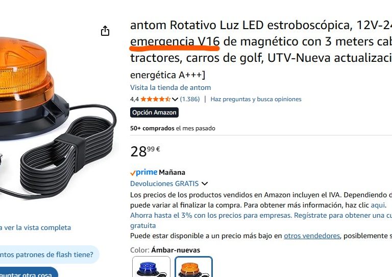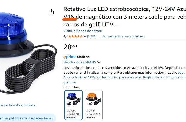 Este dispositivo encontrado en Amazon es un buen ejemplo: la descripción indica “Luz de emergencia V16”, pero solo funciona enchufado a la salida de 12V del vehículo. La normativa exige que las balizas cuenten con alimentación independiente, ya sea con pilas o con una batería recargable. Este accesorio puede indicar una avería, pero no cumple la normativa. Incluso se ofrece en color azul.