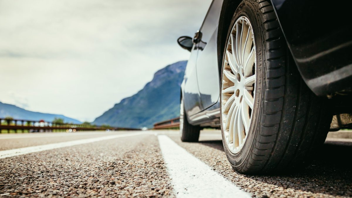 Imagen de la rueda de un coche en la carretera.