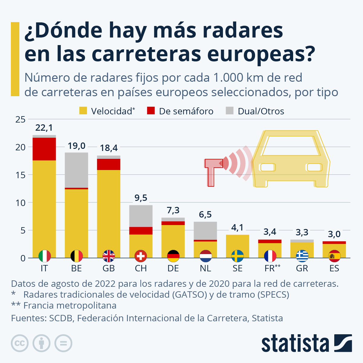 Aunque la percepción de los conductores españoles, es la de que existen demasiados radares en las carreteras del país, la estadística desmiente esta teoría. Según la web Statista.com, España se encuentra en el décimo lugar del ranking europeo con tres aparatos por cada 1.000 kilómetros de carreteras.