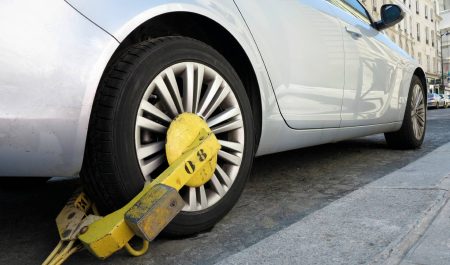Un coche con la rueda bloqueada por un cepo.