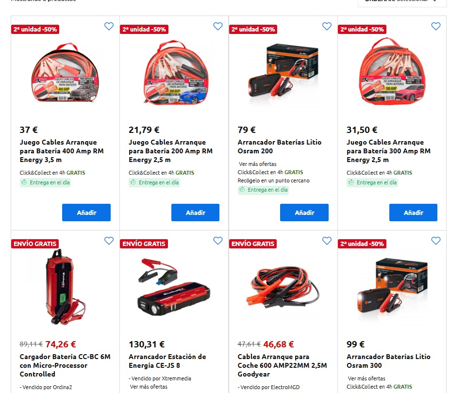 Entre las opciones disponibles, se encuentran arrancadores de baterías de litio de marcas como Osram, con precios que van desde los 79 hasta los 99 euros, y juegos de cables de arranque de diferentes amperajes y longitudes, con precios que oscilan entre los 21,79 y los 37 euros.