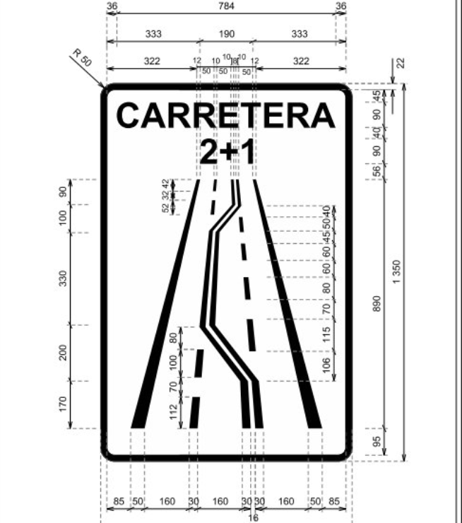 S‐1c. Indica el principio de una carretera 2+1, es decir, aquella que consta de tres carriles de circulación y permite la circulación en ambos sentidos. El carril central se destina a facilitar la maniobra de adelantamiento, estando reservado de manera alterna a uno y otro sentido de circulación. Esta señal pude indicar también el ramal de un nudo que conduce a una carretera 2+1.