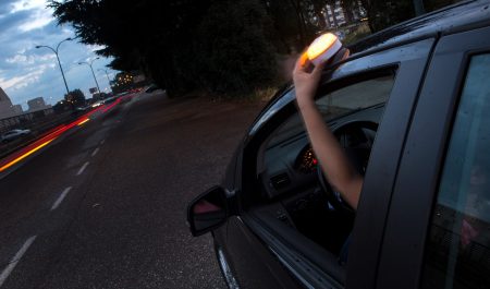 Un conductor colocando una luz v16 de emergencia.