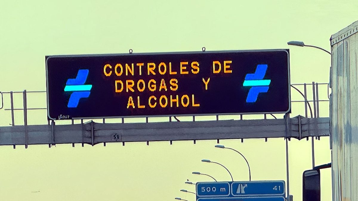 Panel luminoso en carretera avisando de controles de alcohol y drogas. | ELMOTOR