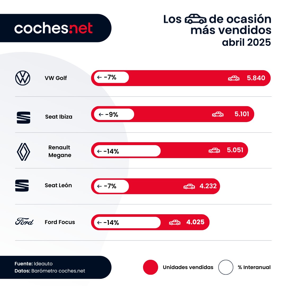 Como es habitual, el top 3 de coches de segunda mano más vendidos en abril es el mismo que el del acumulado del año. El Volkswagen Golf va en cabeza con 23.977 unidades vendidas, el segundo puesto es para el Seat Ibiza con 21.497 unidades y la tercera plaza es para el Renault Megane con 20.699 unidades vendidas.