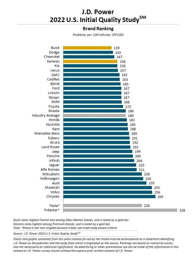 Por marcas y modelos, el parque automovilístico estadounidense es muy diferente al europeo, y estos resultados no son del todo extrapolables a otros mercados. Por ejemplo, las marcas mejor clasificadas en el estudio por su calidad general son Buick (139), Dodge (143) y Chevrolet (147), tres fabricantes que están ausentes a este lado del Atlántico.