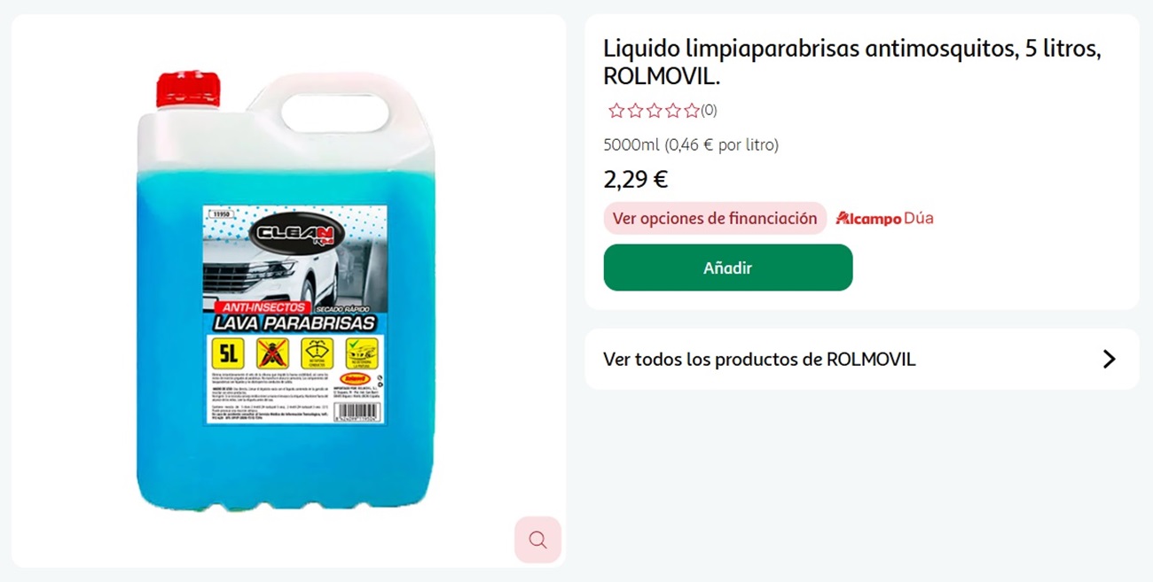 Se trata del líquido limpiaparabrisas antimosquitos de 5 litros de la marca Rolmovil, disponible en Alcampo por apenas 2,29 euros. Es decir, 0,46 por litro y el producto está a la venta en su sitio web.