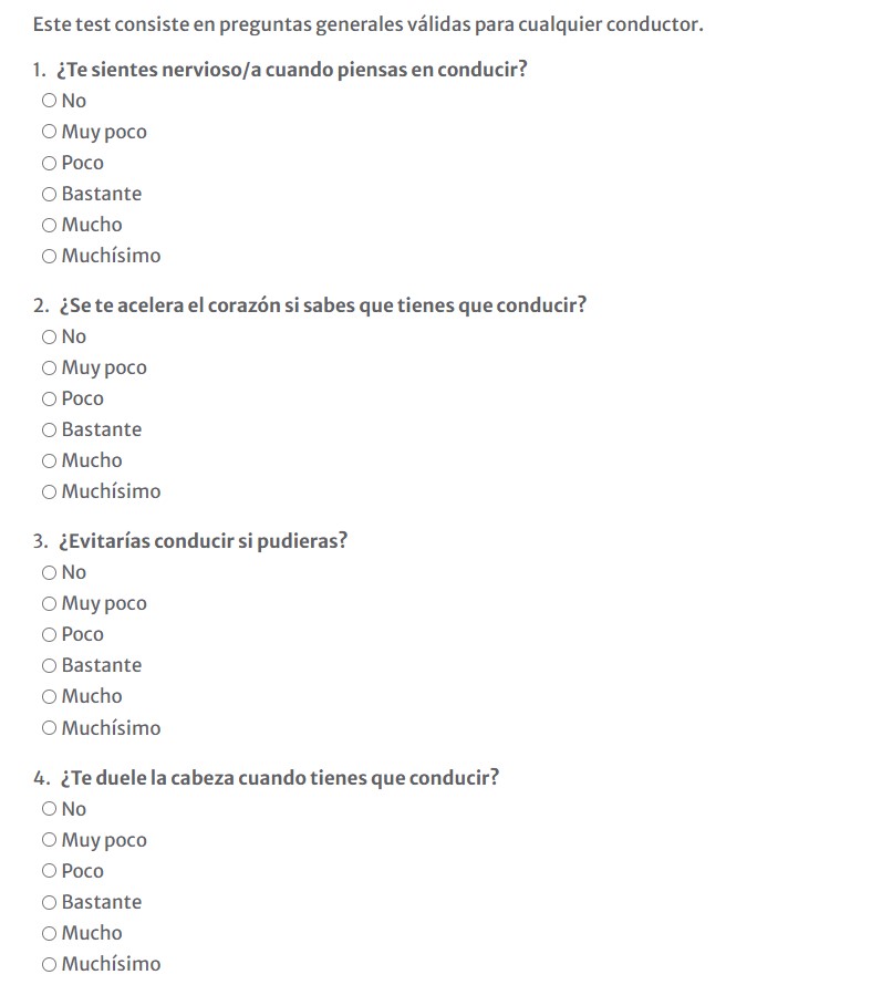 Para enfrentarse al problema, existen pruebas que ayudan a saber si se padece amaxofobia o si se sufre un grado menor de miedo a conducir. Algunas autoescuelas o consultas psicológicas ofrecen cuestionarios gratuitos: