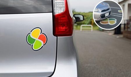 La siguiente imagen muestra cuatro corazones entrelazados de colores verde, amarillo, naranja y rojo, adherida a la parte trasera de un automóvil. Este distintivo se conoce como la koreisha mark o wakaba mark y es un símbolo ampliamente reconocido en Japón.
