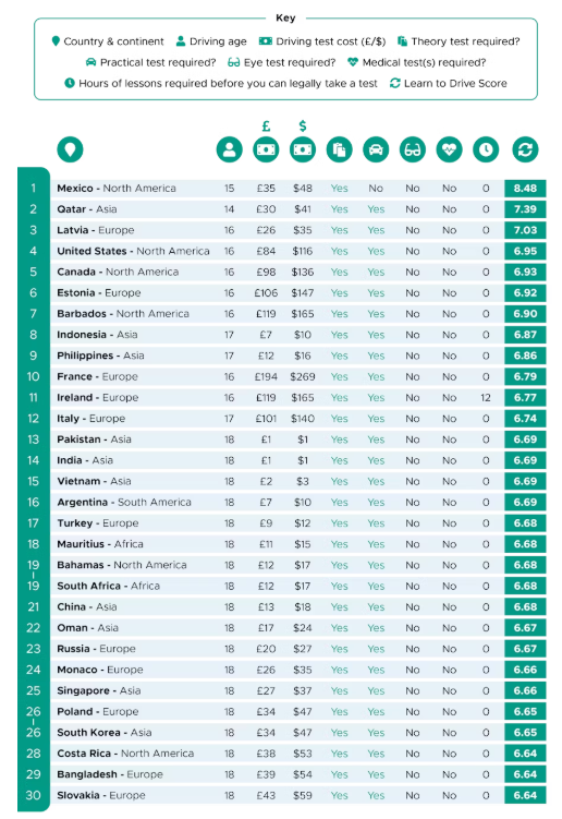 Le siguen Qatar, Letonia (como primer país europeo de este listado), Estados Unidos y Canadá. Dentro de los países en los que más fácil es sacarse el carnet, se encuentran Estonia (en sexta posición), Francia, Irlanda e Italia (en 10ª, 11ª y 12ª posición respectivamente).