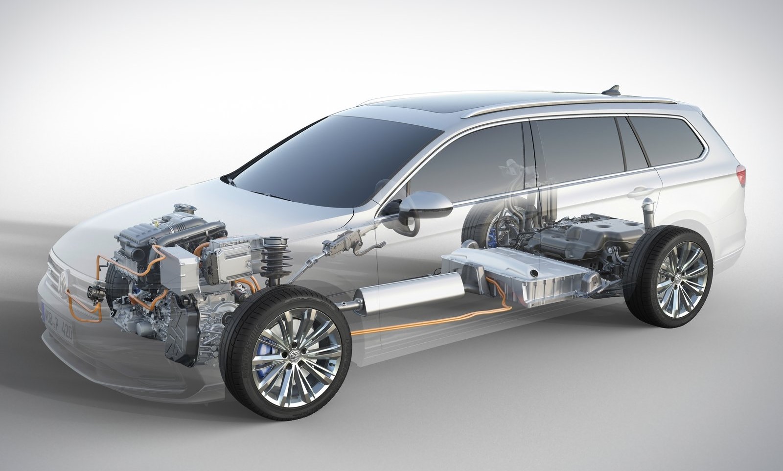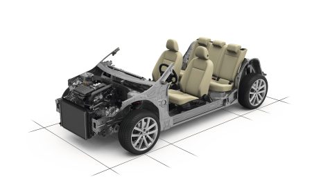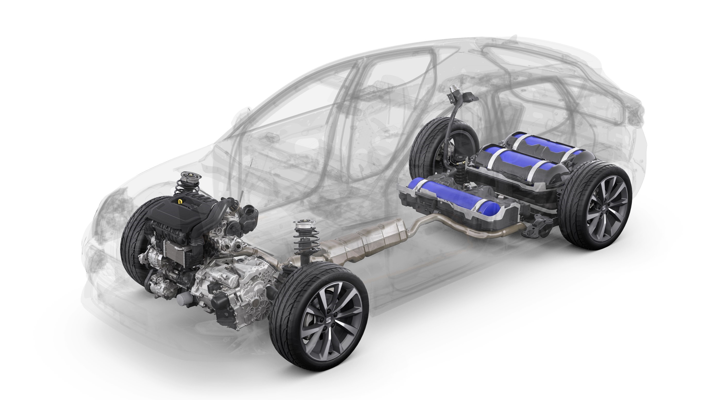 Mecánica de un modelo Híbrido enchufable: delante, los motores térmico y eléctrico; detrás, el módulo de baterías y el depósito de gasolina.