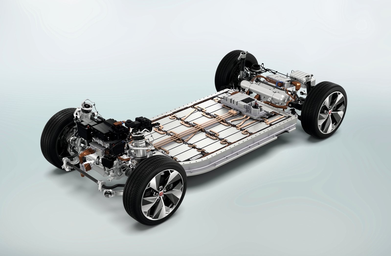 Mecánica de un modelo eléctrico: motores en cada eje, y una plancha de baterías que ocupa toda la superficie central.
