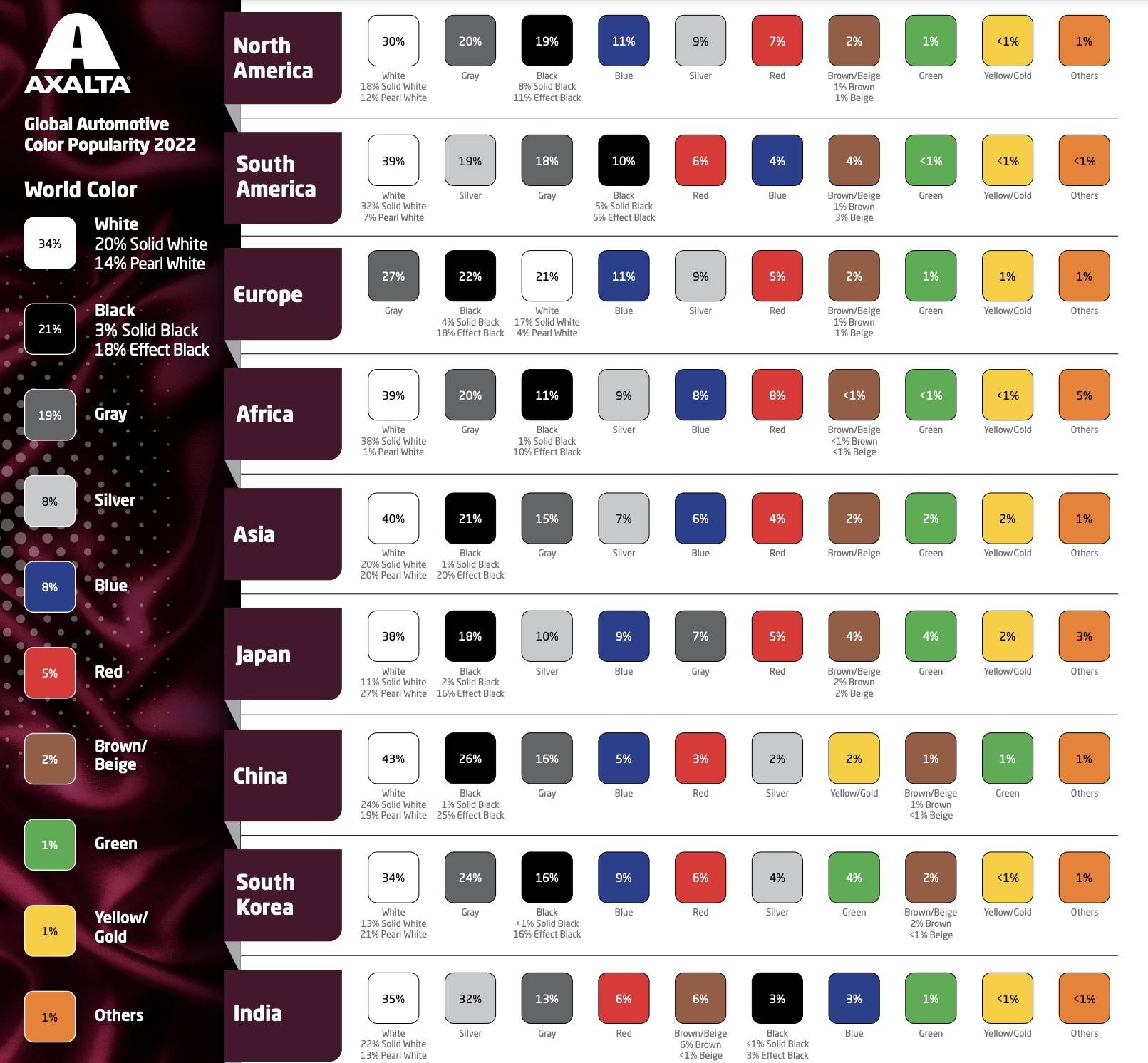 Y otro dato destacable. Entre todas las regiones del mundo, Asia es la que mayor preferencia muestra por el color blanco. De todos los incontables millones de coches que circulan por sus carreteras, casi la mitad (40%) pertenecen a ese grupo tan mayoritario en el mundo.