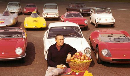 Karl Abarth, junto a varios coches de la marca.