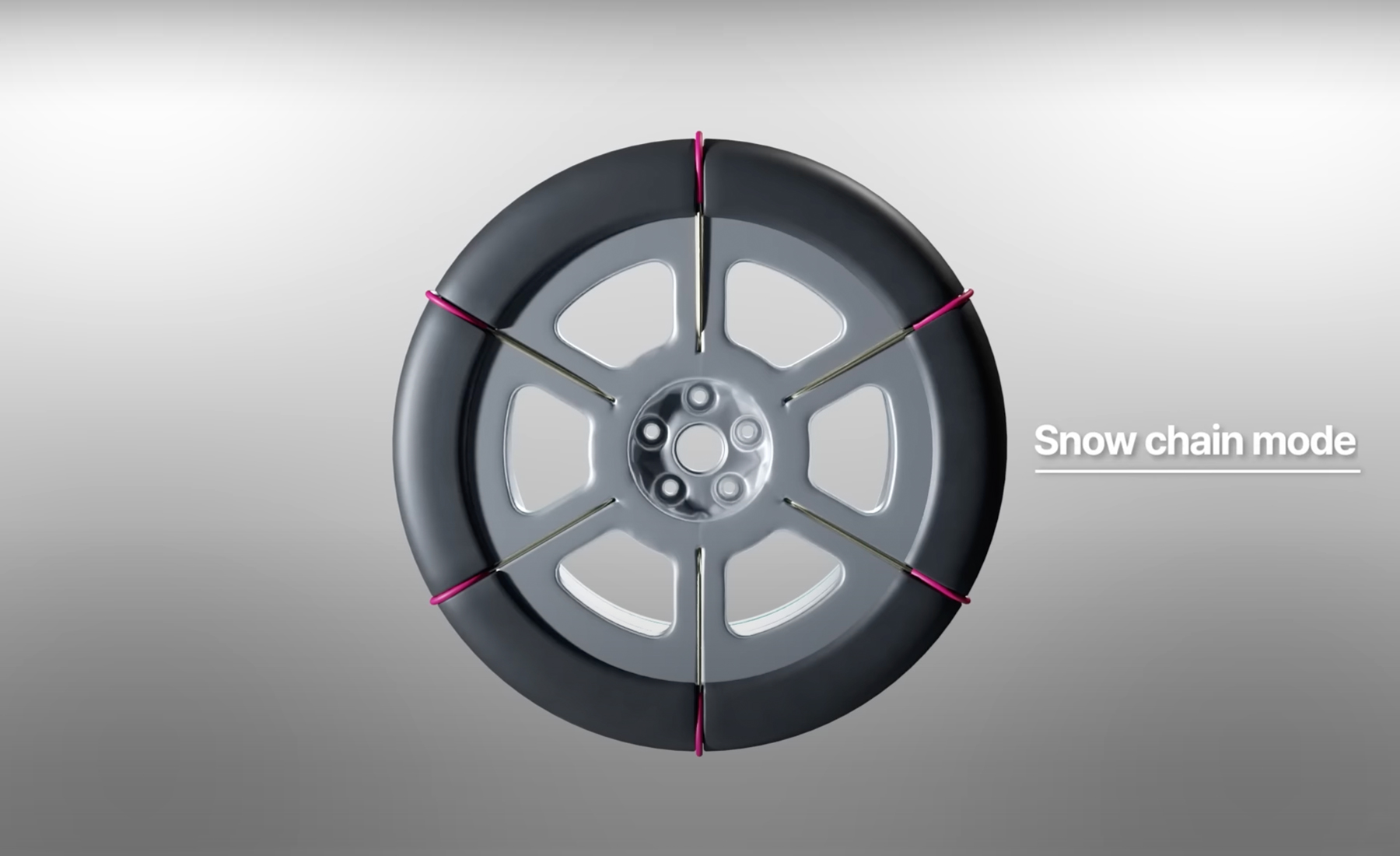 A diferencia de las cadenas de nieve tradicionales que tanto cuesta instalar y desmontar, esta tecnología desplegará automáticamente cadenas de nieve de aleación con solo presionar un botón, lo que ayudará a mejorar la seguridad en condiciones de nieve.