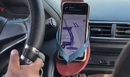 Y no solo eso: las tiras de goma del calzado tapan la pantalla, por lo que dificulta aún más la conducción ya que no se ve la ruta claramente. Y peor aún: el teléfono podría deslizarse y situarse bajo los pedales. Evidentemente, es una práctica riesgosa.